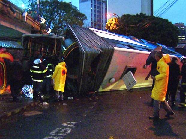Na queda de cerca de 4 metros de altura, segundo a Polícia Militar, o ônibus caiu sobre um outro carro de uma empresa de segurança privada que estava estacionado. Dois vigilantes estavam no veículo, mas não tiveram ferimentos leves e passam bem.