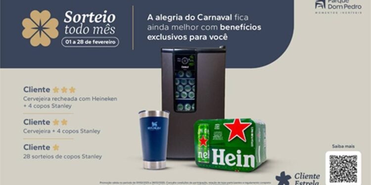 Durante fevereiro, o Parque Dom Pedro Shopping, em Campinas, entra no clima de Carnaval e oferece prêmios especiais para os Clientes Estrela, incluindo uma cervejeira abastecida com Heineken e os desejados copos térmicos Stanley.
