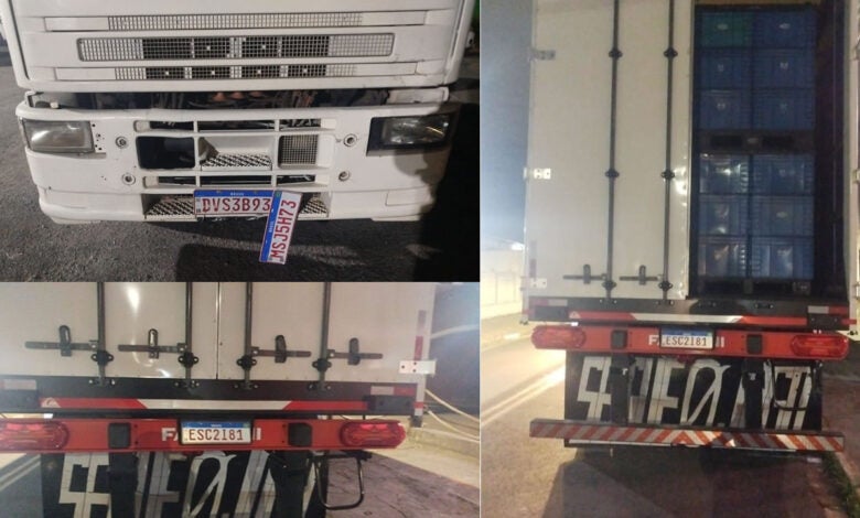 Durante a averiguação, os policiais abordaram o condutor do caminhão e identificaram que o veículo apresentava placas adulteradas. Após consulta ao sistema, foi confirmado que se tratava de um caminhão roubado.