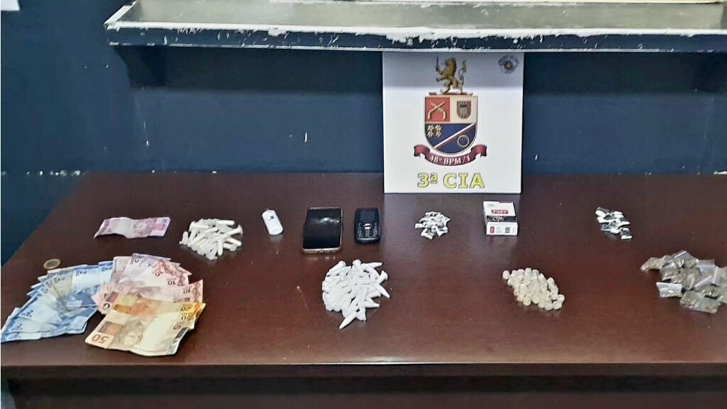 As viaturas da 3ª Companhia cercaram o condomínio, momento em que os suspeitos tentaram fugir ao avistar os policiais. Um deles foi detido enquanto corria próximo ao muro com uma sacola nas mãos. Durante a abordagem, foram encontrados R$ 181 em notas diversas, dois celulares e cinco porções de “dry”, além de uma sacola contendo drogas variadas.