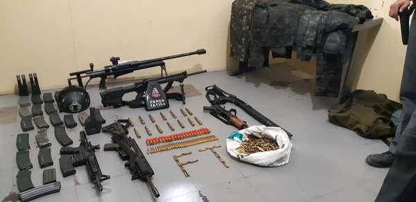 Além de diversas munições de cal 50, Cal 7,62, Cal5,56 e de cal 12. Além de coletes, capacete balístico, roupas táticas.
