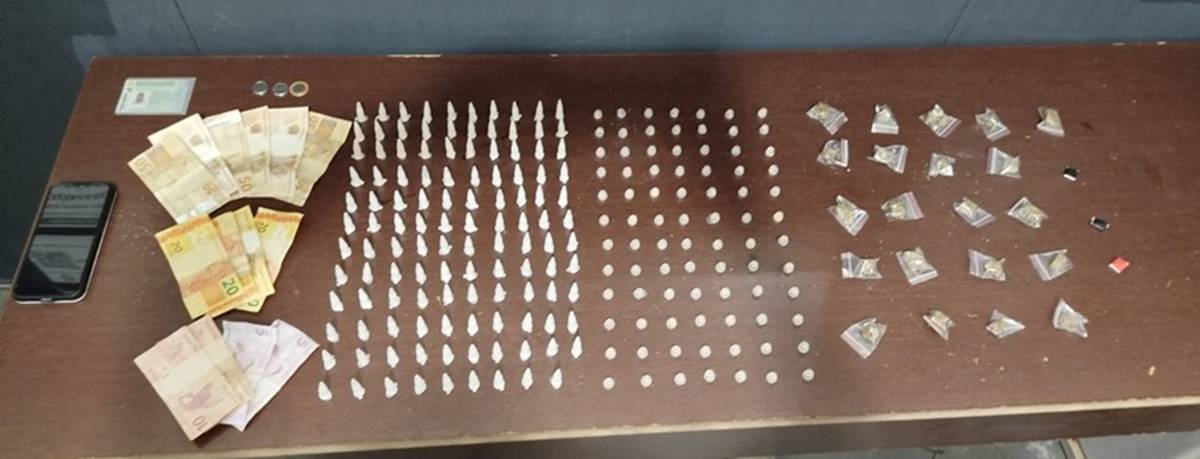 Com o suspeito detido, os policiais encontraram drogas e dinheiro em sua posse. Após informações de moradores, uma busca nas proximidades revelou um estoque maior de entorpecentes.