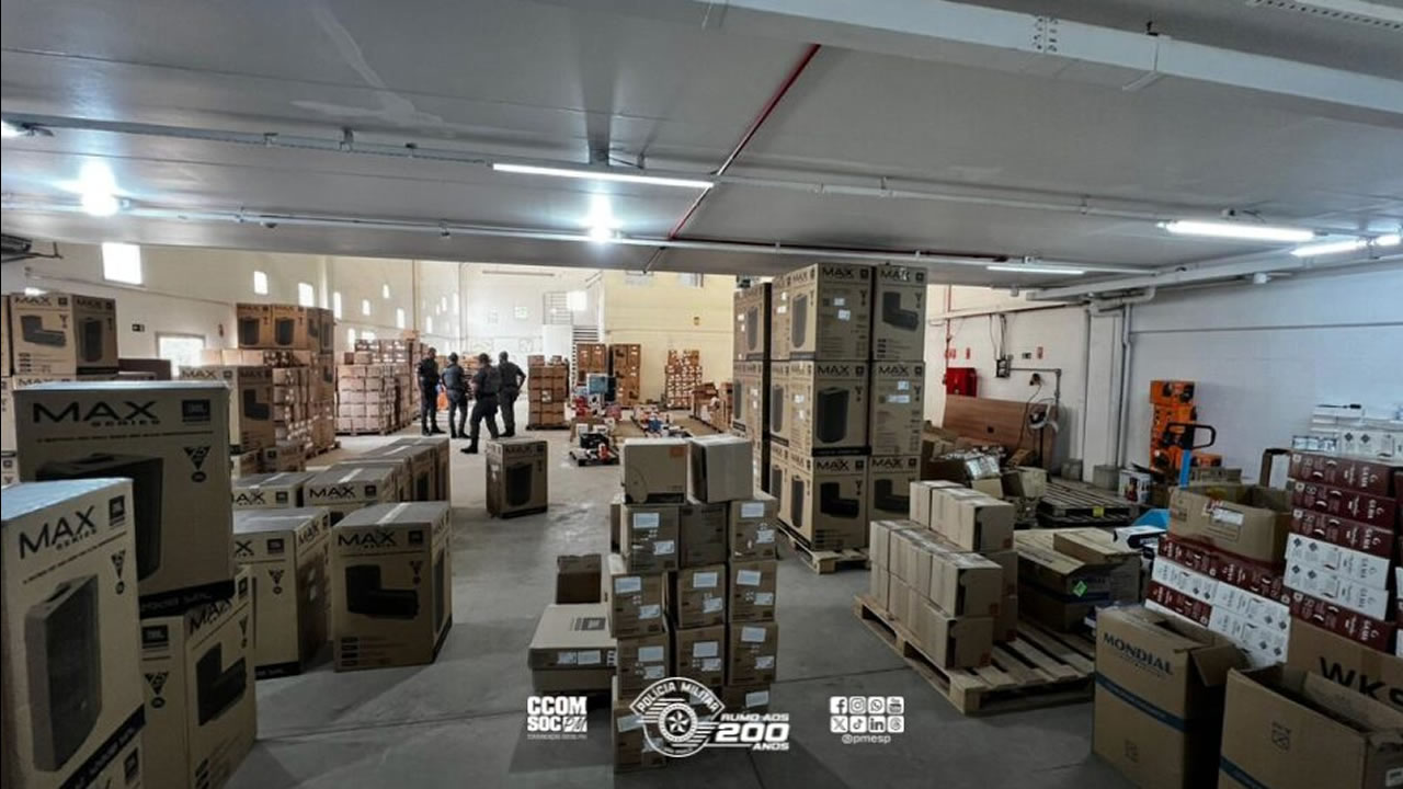 Durante a vistoria no interior do galpão, os policiais localizaram uma grande quantidade de produtos eletrônicos, entre eles equipamentos de som e outros itens de alto valor agregado. Parte da mercadoria foi reconhecida como uma carga roubada no dia 12 de dezembro, durante uma ação criminosa praticada por indivíduos armados.