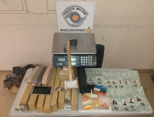 Os PMs escutaram um barulho de escada no local e por entre as frestas no muro visualizaram o rapaz em cima de uma escada e uma mulher entregando uma grande sacola preta para ele. Os militares adentraram e lograram êxito em deter os dois, com diversos tijolos de maconha. Após diligências na residência dos fundos essa de propriedade do indivíduo, foi localizado diversos documentos falsos com fotos de quatro moradores da casa abordada, todos os documentos com identificações diversas.