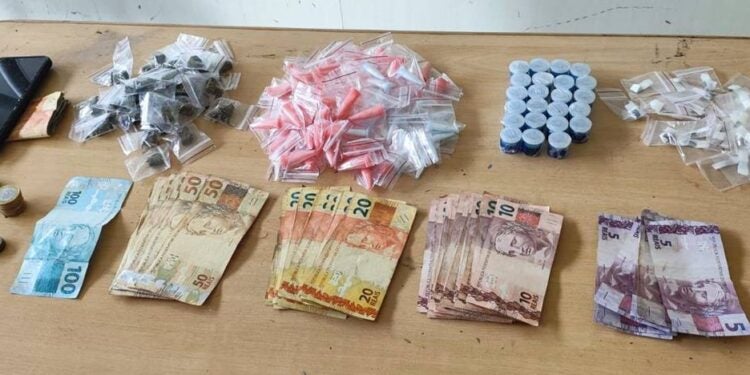 Dentro da bolsa, os policiais encontraram 41 porções de substância semelhante à maconha, 23 unidades de maconha em flor, 80 pinos de cocaína e R$ 1.165,65 em dinheiro.