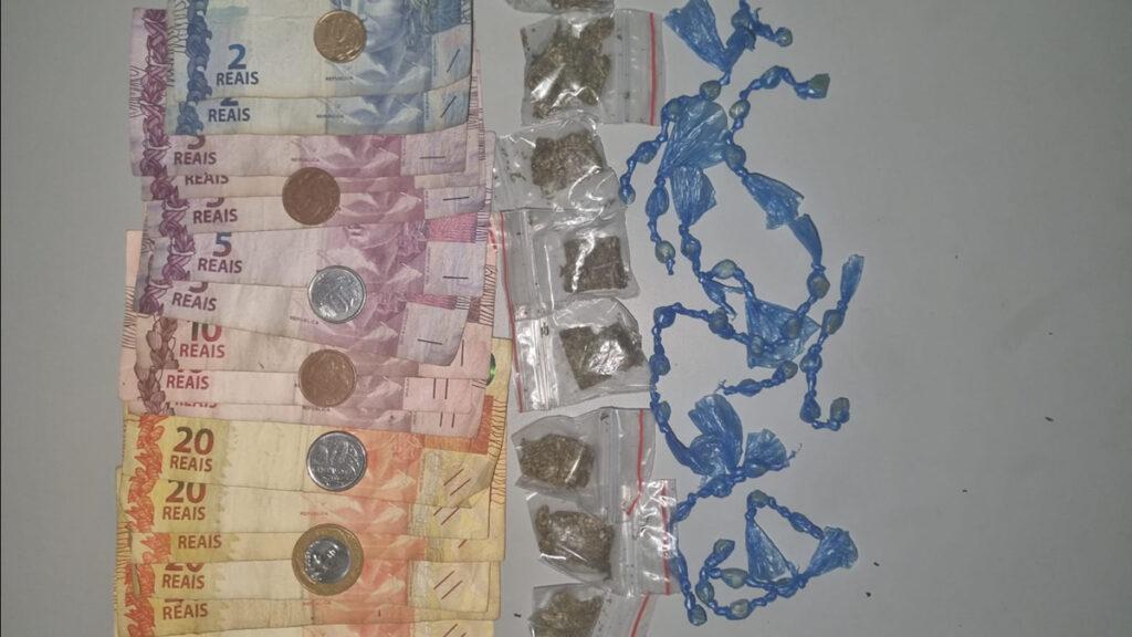 A equipe realizava patrulhamento pelo bairro quando adentrou uma rua e um indivíduo viu a viatura e gritou “LOUÇA”. Rapidamente os agentes perceberam que um segundo homem dispensou algo em uma lixeira, feita abordagem no homem, começou uma varredura e foi encontrado uma bolsa contendo 45 pedras de crack, 8 porções de maconha e 165,80 reais em espécie.