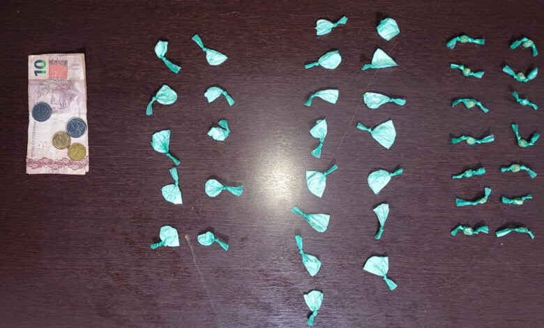 Após perseguição, o suspeito foi abordado. Os agentes retornaram ao trecho onde ele havia dispensado os objetos e encontraram três kits de entorpecentes contendo: