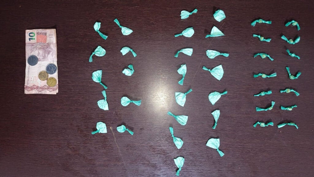 Após perseguição, o suspeito foi abordado. Os agentes retornaram ao trecho onde ele havia dispensado os objetos e encontraram três kits de entorpecentes contendo: