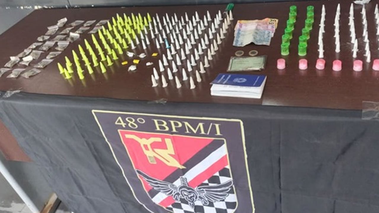 Durante a ação, os agentes apreenderam 74 gramas de maconha, 208 gramas de cocaína, 4 gramas de “dry” e R$ 41,00 em dinheiro. O material estava fracionado e pronto para comercialização, segundo a PM.