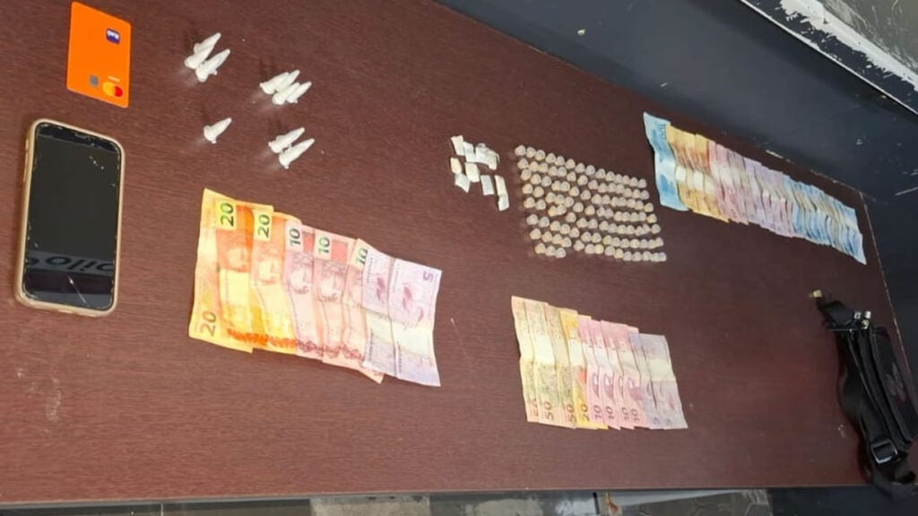 De acordo com a corporação, os agentes avistaram o homem e a mulher em atitude suspeita durante ronda de rotina. O casal foi abordado e, após busca pessoal, foram localizadas drogas com ambos. O homem portava duas porções de entorpecentes no bolso. Já com a mulher, os agentes encontraram 101 porções de crack, 20 porções de cocaína e R$ 495 em dinheiro trocado.