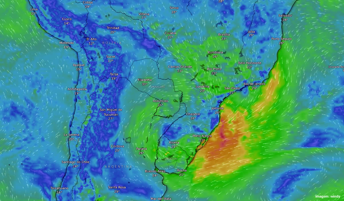 No litoral e na serra de Santa Catarina e do Rio Grande do Sul, as rajadas são as mais preocupantes, podendo atingir picos de 120 km/h.