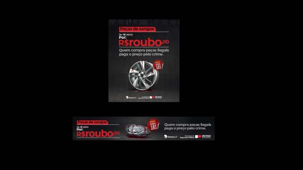 A campanha, criada pela agência Artplan, inclui três filmes, banners eletrônicos e spots de rádio, veiculados em emissoras de televisão e rádio, além de redes sociais e canais do Disque Denúncia. Os filmes mostram anúncios de autopeças enquanto sons de crimes envolvendo veículos são reproduzidos ao fundo. À medida que o sangue das vítimas respinga nas peças, os preços anunciados caem, enfatizando que o valor reduzido dessas peças é devido à sua origem criminosa.