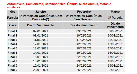 A partir de 4 de janeiro de 2021, é possível optar pelo licenciamento antecipado e realizar o pagamento independentemente do número final da placa do veículo: em cota única, até o dia 20 de janeiro de 2020, com desconto de 3%; em cota única, até o dia 25 de fevereiro de 2020, sem desconto; até o dia 22 de março de 2020, relativamente ao pagamento da terceira parcela, quando tenha ocorrido a opção pelo parcelamento.