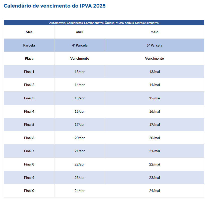 De acordo com o cronograma divulgado pela Secretaria da Fazenda e Planejamento do Estado de São Paulo (Sefaz-SP), o calendário do IPVA 2025 se estende até o dia 24 de abril, quando vence a quarta parcela para os veículos com placa final 0. A consulta do valor do imposto pode ser feita em toda a rede bancária ou no portal da Sefaz-SP, utilizando o número do Renavam (Registro Nacional de Veículo Automotor).