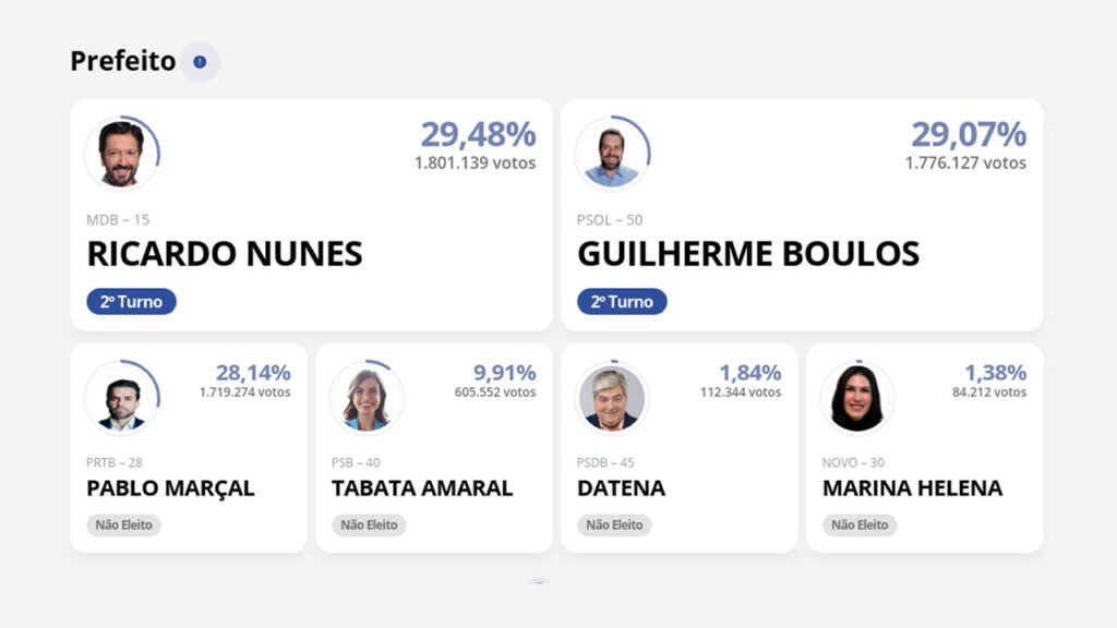 Ricardo Nunes (MDB) e Guilherme Boulos (PSOL) vão disputar o segundo turno da eleição para a Prefeitura de São Paulo. Com 100% das urnas apuradas, Nunes obtém 29,48% dos votos, seguido por Boulos com 29,07%. Pablo Marçal (PRTB) aparece em terceiro lugar, com 28,14%, sendo assim eliminado da disputa.