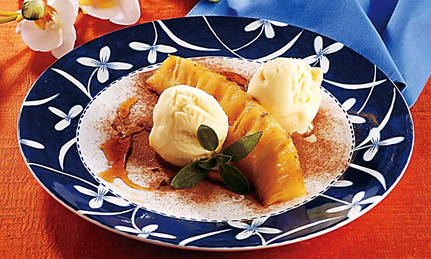 Corte o abacaxi em quatro partes na horizontal e retire o miolo. Reserve. Em uma frigideira grande, ponha o açúcar e deixe derreter até formar uma calda grossa. Junte o gengibre e o cardamomo e misture. Ponha as fatias de abacaxi aos poucos, para caramelar o pedaço por inteiro. Sirva quente ou frio com sorvete de creme e polvilhado com canela em pó.