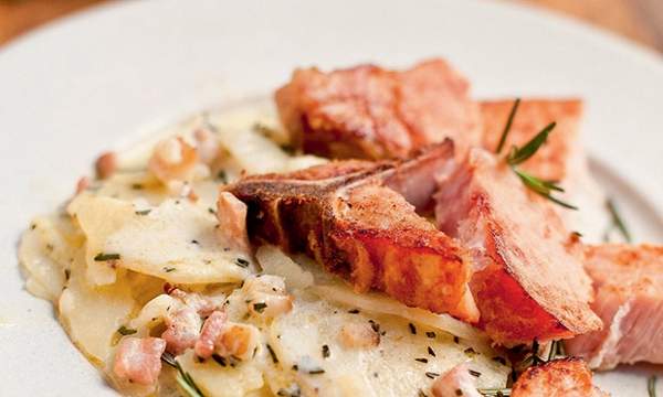 Em uma frigideira grande, refogue ligeiramente o bacon na manteiga. Espalhe as rodelas de batata no fundo da frigideira e junte o leite, sem mexer. Tempere com a noz-moscada, o alecrim e sal e deixe cozinhar por dez minutos ou até que fiquem al dente. Enquanto isso, em outra frigideira, refogue as costeletas e o alho no azeite por dois minutos ou até começarem a dourar. Sirva a carne sobre as batatas ao leite.