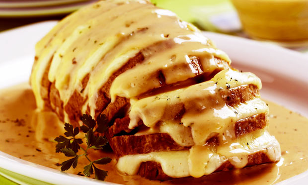 O queijo derretido ganha contraste com o caldo azedinho de laranja. Dica: substitua o tipo de queijo de acordo com o seu gosto