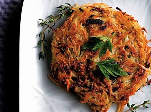 Em um escorredor encaixado em uma tigela, junte a batata e a cebola e deixe descansar por 15 minutos, pressionando ligeiramente para retirar o líquido. Em uma tigela, misture o ovo com a farinha, o sal e a pimenta. Junte a batata com a cebola, a salsinha (reserve algumas folhas para decorar) e 1 ramo de tomilho desfolhado. Em uma frigideira antiaderente grande, aqueça metade do óleo em fogo médio. Despeje 1/4 de xícara da mistura na frigideira. Achate-a, formando a panqueca, e doure por quatro minutos de cada lado. Reserve em uma travessa coberta com papel-alumínio. Repita a operação com o restante da massa acrescentando o óleo aos poucos. Sirva as panquecas decoradas com a salsinha e o tomilho restantes.