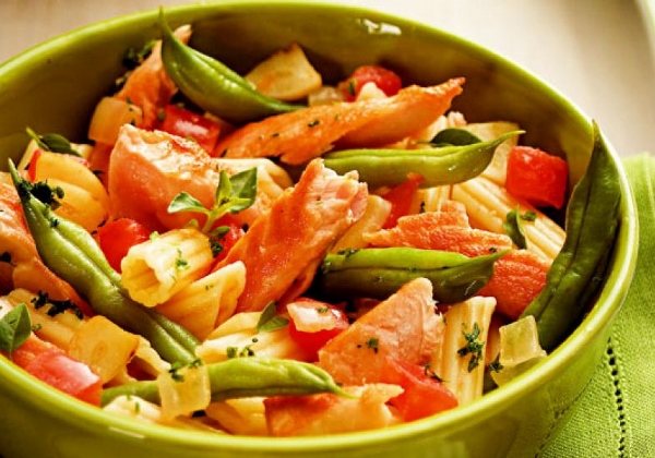 Cozinhe o penne al dente, escorra e reserve. Em uma panela antiaderente, aqueça a margarina e doure o alho e a cebola. Tempere o salmão com meia colher de chá do sal e doure-o dos dois lados. Retire e reserve. Na mesma panela, junte o tomate, a vagem, o louro e o restante do sal. Deixe apurar. Adicione a salsa, o manjericão e o salmão em lascas. Ajuste o sal e misture na massa delicadamente. Regue com o azeite e sirva em seguida.