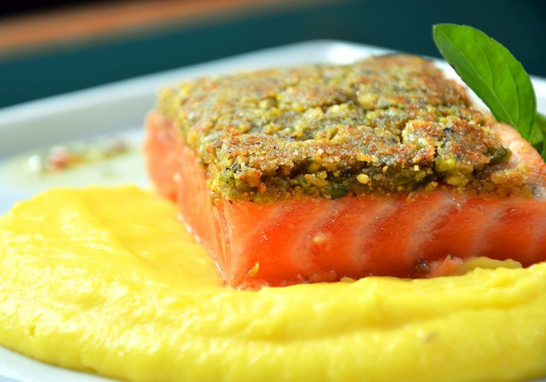 Misture a manteiga com o pistache, a farinha de rosca, o parmesão e a água. Faça uma crosta na parte de cima do salmão. Doure essa crosta em uma frigideira, em seguida leve o peixe ao forno (pré-aquecido a 180 °C) por 5 minutos.