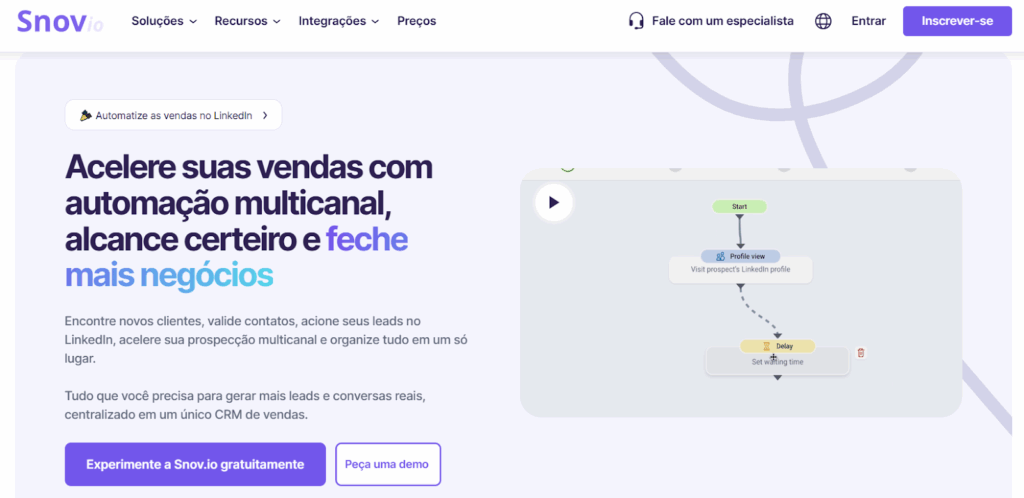 A Snov.io é uma das ferramentas mais completas para geração de leads, combinando busca de email, verificação, campanhas automatizadas e integração com CRM em um único ambiente. Para equipes que precisam escalar prospecção com precisão, ela se destaca pela excelente taxa de acerto no Email Finder e pelo ecossistema que conecta descoberta de leads à nutrição e acompanhamento.