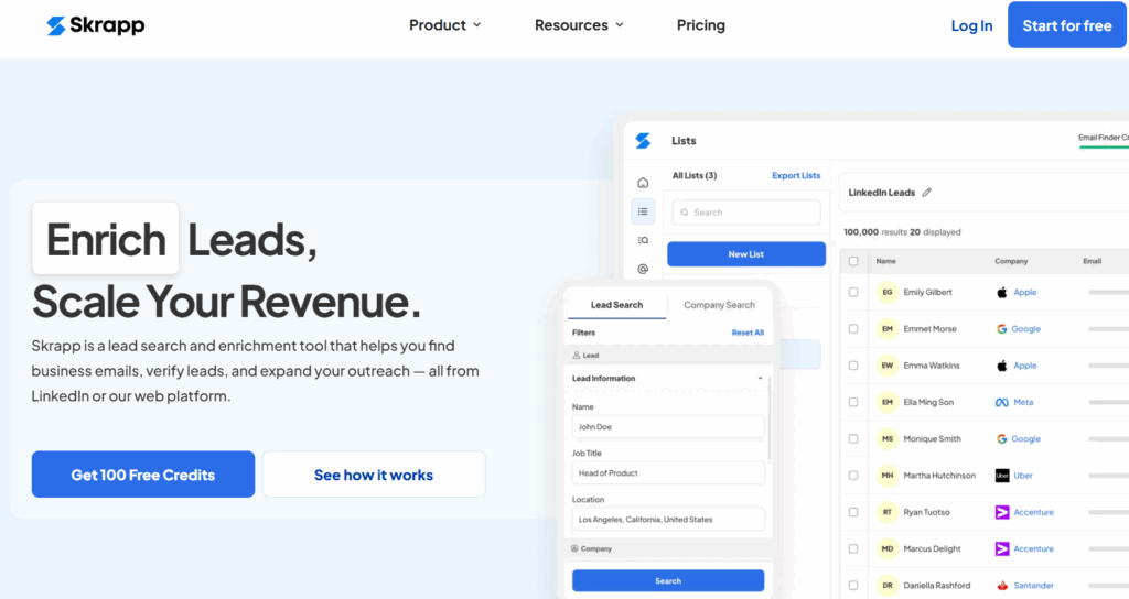 O Skrapp é uma ferramenta muito popular entre profissionais de vendas por sua facilidade de uso. Ele permite encontrar e-mails corporativos principalmente por meio da extensão Chrome, que extrai contatos diretamente de sites ou perfis do LinkedIn. É uma solução ideal para quem trabalha com prospecção manual e precisa validar rapidamente os contatos encontrados.