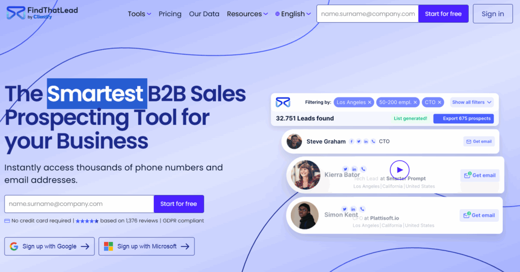 O FindThatLead é uma ferramenta bastante prática para encontrar e-mails a partir de domínios, perfis sociais e listas de empresas. Ela se destaca pela simplicidade e pela velocidade com que retorna resultados, sendo ideal para pequenas e médias equipes que desejam iniciar campanhas de outbound de forma ágil.