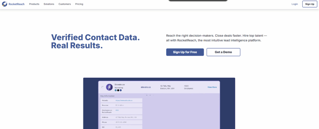 Para equipes que priorizam qualidade sobre quantidade, o RocketReach se destaca. Muitas empresas o utilizam para identificar decisores estratégicos, fazer account-based marketing (ABM) ou validar contatos difíceis de encontrar em outras plataformas. Seu banco de dados é constantemente atualizado e oferece informações completas que agilizam pesquisas profundas.