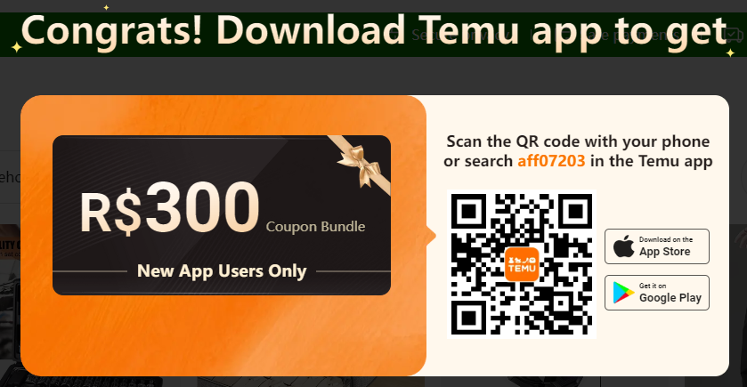 Código promocional TEMU exclusivo: Use o código “aff07203” para obter 30% de desconto. Então, por que esperar? Mergulhe na Temu hoje mesmo e veja o que está acontecendo. Boas compras e não se esqueça de usar esse código!
