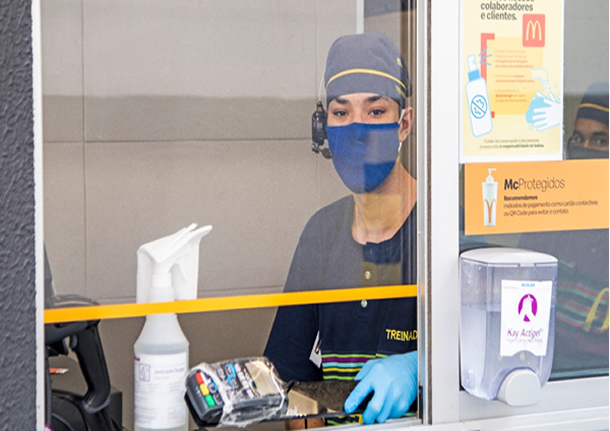 - Nos caixas do Balcão, Quiosque e McCafé, nas áreas de retirada e nas cabines do Drive-Thru foram implantadas barreiras de acrílico para reduzir o contato.