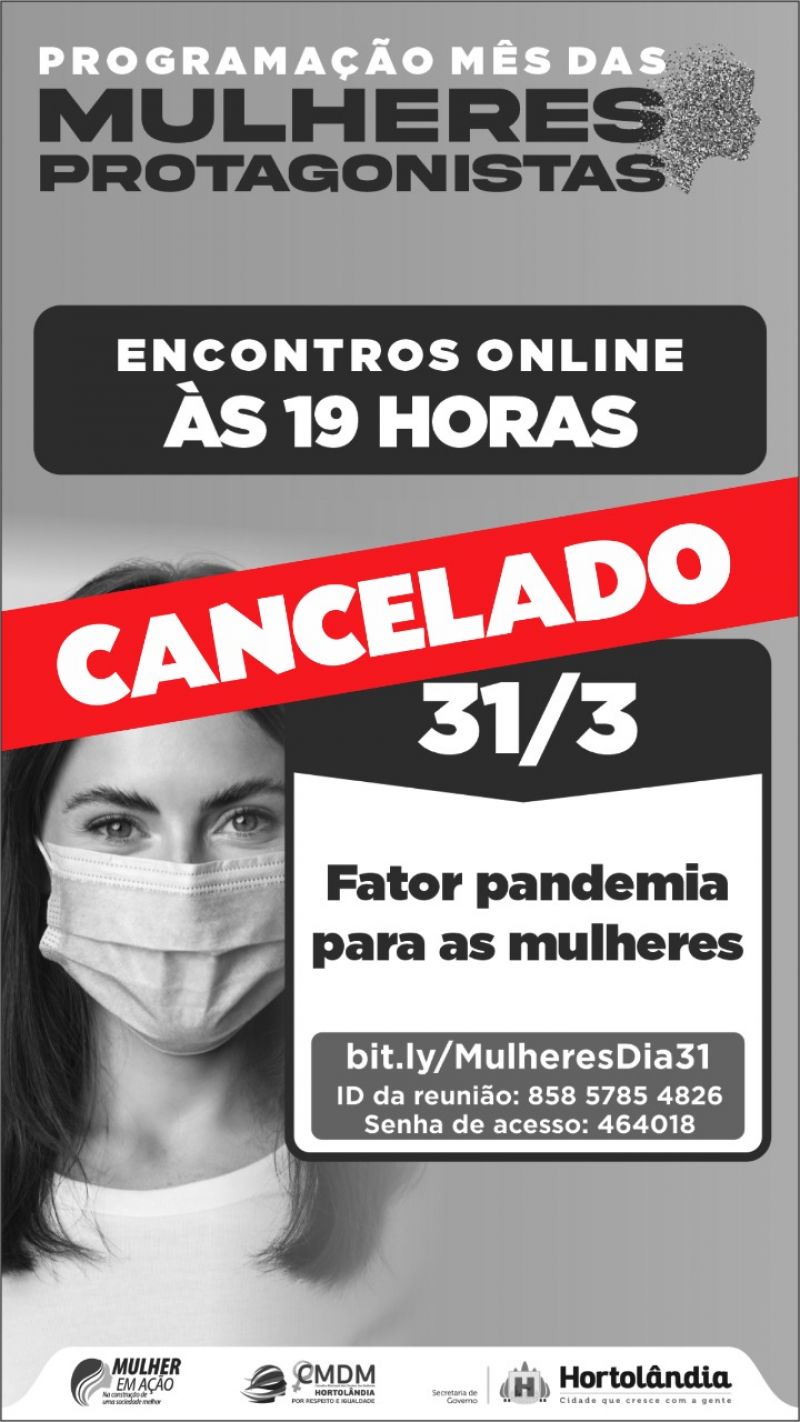 A palestra sobre o “Fator pandemia para as mulheres”, integrante da programação especial elaborada pela Prefeitura de Hortolândia para o Mês da Mulher, prevista para esta quarta-feira (31/03), foi cancelada. A Secretaria de Governo ainda não divulgou nova data para a realização do evento.
