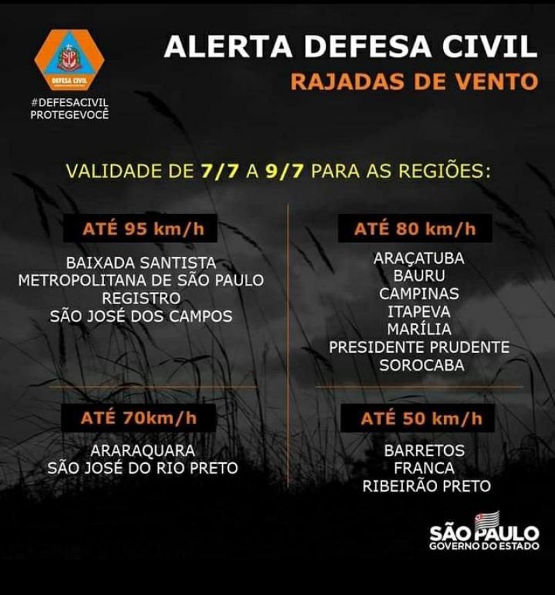 A Defesa Civil do Estado de São Paulo emitiu, nesta terça-feira (07/07), um alerta de ventos fortes para a região de Campinas, entre a noite de hoje até a quinta-feira (09/09). Segundo o órgão estadual, as rajadas de vento devem chegar até 80 km/h em cidades da Região Metropolitana de Campinas.