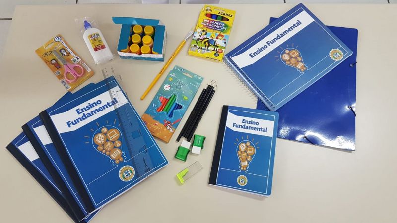 Cada aluno receberá, neste início de ano letivo, um kit composto por diversos materiais, organizado para atender as necessidades de cada modalidade de ensino e faixa etária. Entre os materiais estão cadernos, lápis, borracha, apontador, tesoura, cola e lápis de cor. Há oito tipos diferentes de kits.