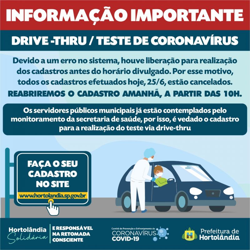 A Prefeitura de Hortolândia informa que, em virtude de erro do sistema, abrirá um novo cadastro para o drive-thru dos testes rápidos da COVID-19. O novo cadastro estará disponível nesta sexta-feira (26/06), às 10h, no site da Prefeitura, http://www2.hortolandia.sp.gov.br/. Em razão disso, todos os cadastros feitos nesta quinta-feira (25/06) foram cancelados. Será vedado o cadastro para servidores municipais, uma vez que eles estão contemplados com monitoramento e cronograma da Secretaria de Saúde. O drive-thru de teste rápido será no Parque Socioambiental Lago da Fé, neste sábado e domingo (27 e 28/06), das 8h às 13h. O parque fica na avenida Joaquim Martarolli, Jardim Nova Alvorada.