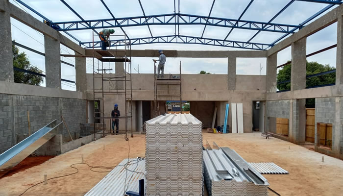 A Prefeitura de Hortolândia trabalha, nesta semana, na instalação de calhas metálicas do telhado. A arquibancada do novo espaço também está em construção.