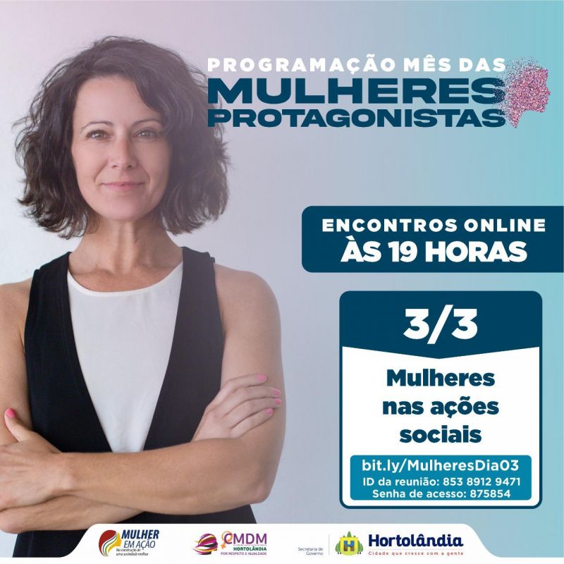 A programação especial para o Mês da Mulher, elaborada pela Prefeitura de Hortolândia, começa nesta quarta-feira (03/03), às 19h, enfocando as “Mulheres nas ações sociais”. Os diálogos têm como tema “Mulheres Protagonistas”. A iniciativa é do Departamento de Direitos Humanos e Políticas Públicas para Mulheres da Secretaria de Governo, por meio do Setor de Políticas Públicas para Mulheres, em parceria com o Conselho Municipal dos Direitos da Mulher e a ONG Mulher em Ação.