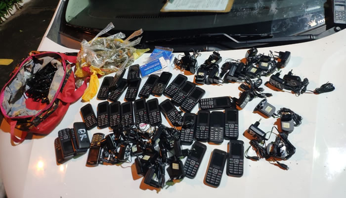 Três alicates, uma bateria de celular, um fone de ouvido, 20 chips, 40 carregadores e 49 celulares, além de 450 gramas de maconha estava nas mochilas.