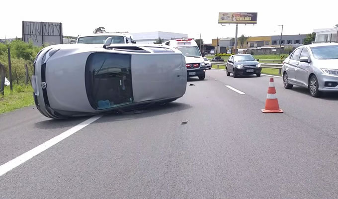 O carro capotou por mais de 20 metros e, só não foi mais grave porque durante o capotamento o veículo colidiu na roda dianteira do ônibus do transporte coletivo intermunicipal. O veículo ficou atravessado na pista dois.